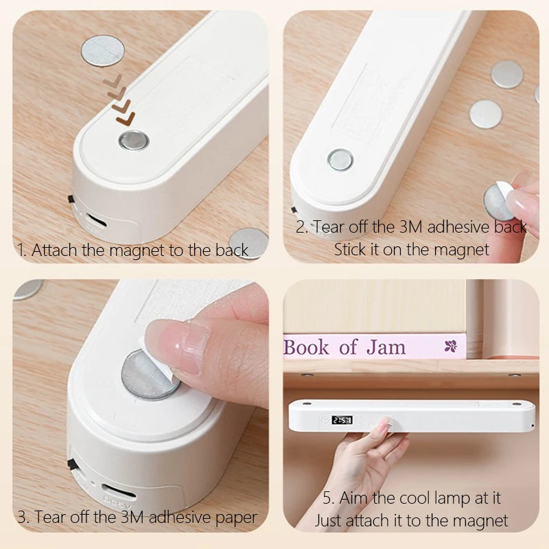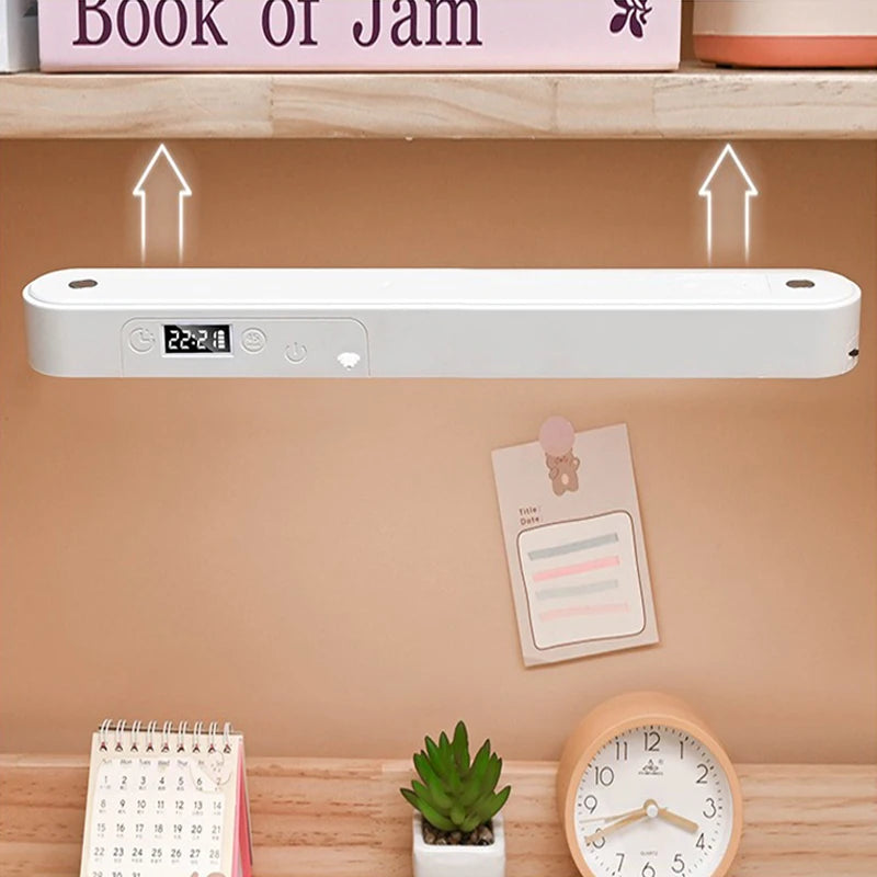 A unique blend of style and function, this hanging magnetic desk lamp features an integrated clock, stepless dimming, and USB rechargeability — ideal for desks, closets, cabinets, or bedside use.